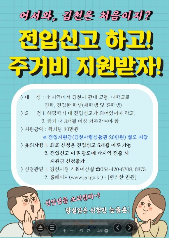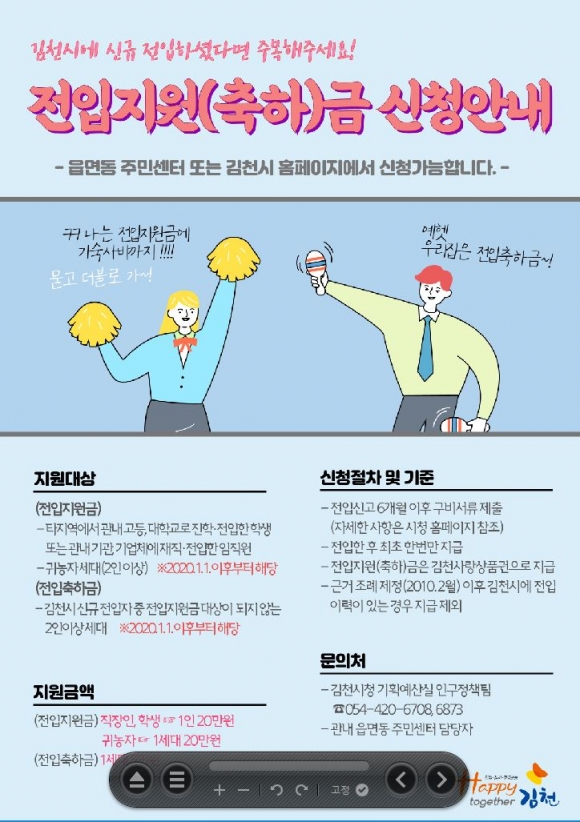 또한 비대면 홍보 강화를 위해 전입자 가이드북, 전입자 혜택 홍보 포스터 등을 제작하여 유관 기관·기업체, 읍면동에 배부하고 있으며, 인구증가시책 지원금 신청을 온라인으로 안내, 권장하며 대면접촉을 최소화하는 등 방역수칙 준수에도 최선의 노력을 기울이고 있다. (관련문의☎ 김천시청 기획예산실 인구정책팀 054-420-6873) |