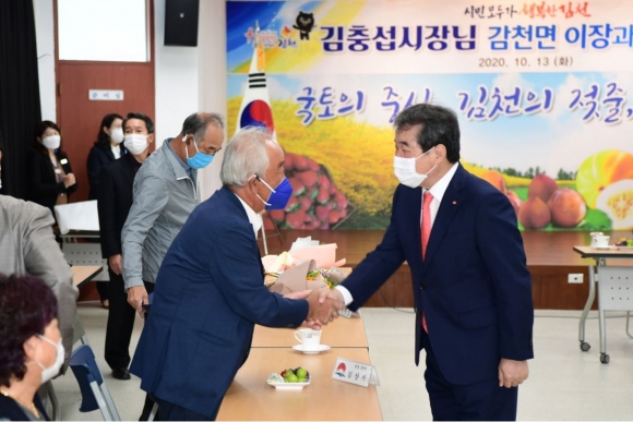 김충섭 김천시장은 10월 13일 오전 감천면사무소 2층 회의실에서 행정의 일선에서 헌신하고 있는 이장들을 격려하기 위해 소통 간담회를 개최했다. 이번 소통 간담회는 코로나19 대응을 위한 각종 사업 추진에 헌신하고 있는 이장들을 격려하고, 주요 현안 사업에 대한 여론 및 각종 애로사항을 청취하고 시정에 반영함으로써 소통 행정을 구현하고자 시간을 마련하였다. 또한, 코로나19 감염병 유행으로 미뤄졌던 임기만료 이장님들께 감사패 전달식도 행해졌다. 이어 진행된 간담회에서 천병수 회장 및 이장들은 지은지 30년이 지난 감천면 청사 및 면민 복지회관 건립, 감천교차로에서 긴방천으로 이어지는 우회도로 개설 등 감천면 현안에 대한 다양한 건의와 함께 시정 발전에 대해 대화의 시간을 가졌다. 천병수 이장협의회장은 “올해는 특히 코로나19 전염병 유행으로 더욱 힘든 시기를 겪고 있음에도 불구하고 시민행복과 김천 발전을 위해 애쓰시는 김충섭 시장님이 지역 주민과 소통하고자 이런 자리를 만들어주셔서 감사드리며 앞으로도 시정발전에 위해 최선을 다하겠다.”고 전했다. 김충섭 시장님은 “코로나19 방역활동, 마스크 전달 등 지역발전과 주민화합을 위해 일선에서 헌신적으로 활동해 준 이장님들 노고에 감사드린다. 지역 주민들의 소리를 소중히 귀담아 들어 시정에 적극 반영하도록 노력하겠으며 시민 모두가 행복한 김천 건설을 위해 대화하고 소통하면서 지속적으로 협력해 나가자.”고 했다. |