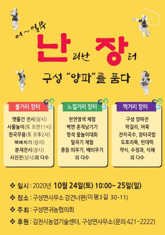 구성면귀농협의회(회장 이응만)는 오는 24~25일 김천시 구성면사무소 강건너편 일원(미평3길 30-11)에서 ‘구성 “양파”를 품다’ 주제로 난장(난리난 장터) 행사를 개최한다.