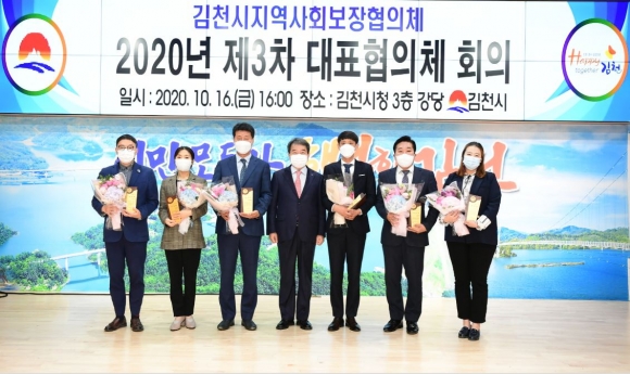 김천시지역사회보장협의체(위원장 김충섭, 공동위원장 배수향)는 지난 16일 김천시청 강당에서 지역사회보장협의체 위원 20명이 참석한 가운데 김천시지역사회보장협의체 2020년도 제3차 대표협의체 회의를 개최 했다. 이날 회의 전 지역복지발전 유공자 7명에게 표창패를 수여하고, 이웃나눔 실천기관(KT&G김천공장)에 감사패를 수여하였다. 김천시는 매년 사회복지의 날을 맞아 개최되는 복지박람회에서 지역복지발전 유공자 표창패와 감사패를 수여하였으나, 올해는 코로나19 확산 예방을 위해 행사를 취소하고, 지역사회보장협의체 회의에서 수여하게 되었다.