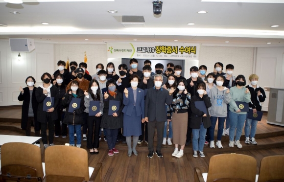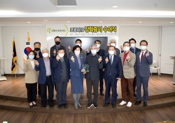 김천대학교(총장 윤옥현)는 11월 2일(월) 오후 1시 30분 세미나실(본관 5층)에서 상록수장학재단이 대학 발전을 위한 기부금 5천만원을 코로나19 장학금으로 지급하는 장학증서 수여식이 있었다. 윤옥현 총장을 비롯한 보직교수와 이상춘 상록수장학재단 이사장이 참석한 가운데 진행된 수여식에는 총 125명의 장학생을 대표해서 각 학과별 대표 수여 학생 31명에게 장학증서가 전달되었다. 장학금은 상록수장학재단에서 기부한 장학금으로 코로나19로 인해 경제적으로 어려움을 겪고 있는 재학생을 대상으로 신청을 받아 소득 정도에 따라 지급했다.
