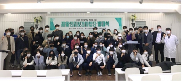 김천대학교(총장 윤옥현) 재활인지보건사업단은 30일 김천대학교 다비드홀(본관 6층)에서 ‘자율순환형 재활인지보건사업단’ 발대식을 가졌다. 발대식에는 김천대학교 물리치료학과 인태성, 김동훈교수, 작업치료학과 김형민교수 및 재학생 50여 명이 참석하였다. 이날 코로나 19 확산 방지를 위해 발열 체크, 손소독, 마스크 착용 등의 철저한 방역 수칙을 준수한 가운데 행사를 진행하였다.