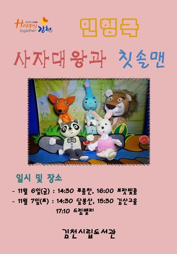 김천시립도서관에서는 오는 11월 6일(금) 푸름찬 오후 2시 30분, 보랏빛꿈 4시, 11월 7일(토) 달봉산 2시 30분, 김산고을 3시 30분, 드림밸리 5시 10분 총 5회에 걸쳐 각 작은도서관에서 1인 손 인형극 <사자대왕과 칫솔맨>을 공연한다. 신나는 노래와 율동으로 포문을 여는 <사자대왕과 칫솔맨>은 어린이들에게 호기심을 일깨우는 신개념 악보 마술과 함께 참신하고 기발한 캐릭터의 이야기로 웃음을 견인할 예정이다. 이번 인형극 공연은 작은도서관에서 처음 시행하는 만큼 주 이용층인 어린이들의 눈높이에 맞춰 더욱 가까이에서 생동감 넘치는 공연을 볼 수 있을 것으로 기대된다. 또한 하반기 예정된 어린이 문화공연인 11월 14일(토) 도서관 생쥐는 관람권 배부가 완료되었고, 11월 21일(토) 책방속 마법우체국과 12월 5일(토) 재크와 콩나무는 각각 11월 10일(화), 11월 17일(화)부터 관람권이 배부될 예정이다. |