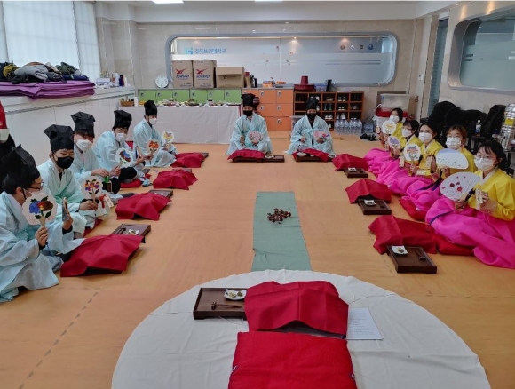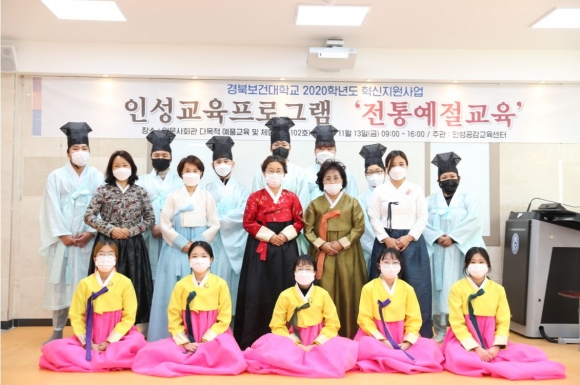 경북보건대학교(총장 이은직) 인성공감교육센터(센터장 김지년)는 2020학년도 전문대학 혁신지원사업-인성 및 공감능력 교육 혁신프로그램의 일환으로 11월 13일(금) 인문사회관 다목적 예품교육 체험실에서 ‘전통예절교육’프로그램을 실시하였다. 이번 ‘전통예절교육’프로그램은 재학생들의 인성역량 강화와 개인소양 및 인간으로서 갖추어야 할 덕목 함양, 전통문화 체험을 통한 우리 것에 대한 자긍심 고취를 위해 예당문화 교육원의 전문강사를 초빙하여 진행되었으며, 참여 재학생 20명은 한복을 입고 기본 예절과 나만의 부채&호패 만들기, 다례를 통한 바른예절, 다식 및 떡만들기, 나도 선비다, 향음주례를 체험하는 등 유익한 시간을 가졌습니다.