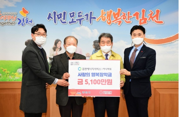 김천에너지서비스(대표 임락근)은 지난 26일 김천시청을 방문하여 장학금 5,100만원을 전달했다. 임락근 대표는 “어려운 환경에서도 꿈을 갖고 미래에 도전하는 청소년들의 꿈을 응원하기 위해 매년 장학금을 기탁하고 있으며, 앞으로도 지역의 발전과 나눔 문화에 실천에 함께하는 기업이 되도록 노력할 것.”이라고 말했다. 김충섭 김천시장은 “코로나19로 어느 때보다도 힘든 환경 속에서도 매년 잊지 않고 저소득가정 학생을 위한 장학금을 지원해주셔서 감사드린다. 자라나는 아이들이 더 큰 꿈을 꾸고 미래를 설계할 수 있도록 행정에서도 최선을 다하겠다.”며 감사의 인사를 전했다. 한편 김천산업단지 내 위치하고 있는 김천에너지서비스는 2013년부터 매년 5천여만 원의 장학금을 전달하였으며, 이날 전달된 장학금은 기탁자의 뜻에 따라 발전소 반경 5km내에 거주 중인 저소득가정 중·고등학생들에게 전달 될 예정이다. |