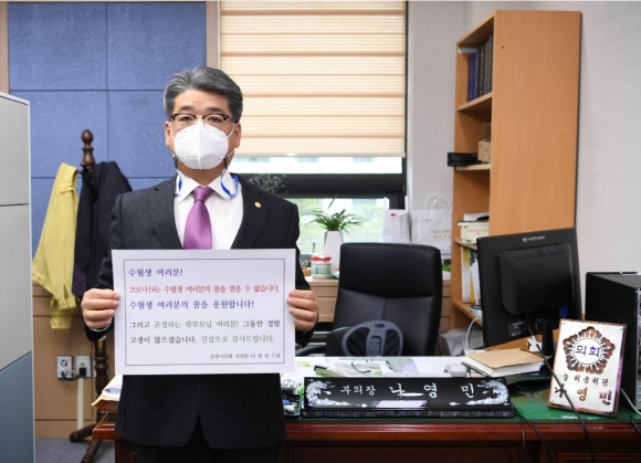김천시의회 나영민 부의장은 12월 3일 치러지는 2021학년도 대학수학능력시험에 응시하는 수험생을 격려했다.나 부의장은 매년 수험장을 찾아 수험생을 격려했으나 올해는 코로나19 감염을 예방하기 위해 직접 찾아가는 대신 온라인 격려로 대신했다. 이번 격려에서 나 부의장은 “코로나19는 수험생의 꿈을 꺾을 수 없으며, 12월 3일은 수험생의 그동안 흘린 땀이 비로소 알찬 결실을 맺는 바로 그 순간이다” 라며 수험생 모두의 꿈을 응원했다. 또한 코로나19로 정상적인 학교 수업이 이루어지지 않는 상황에서 어느 해보다 힘들게 자녀의 뒷바라지에 고생한 학부모에게도 감사의 마음을 전달했다. |