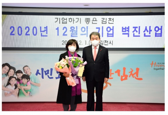 김천시(시장 김충섭)는 12월 이달의 기업으로 벽진산업(대표 이명자)을 선정하고 1일 김천시청에서 이명자 대표 및 임직원 등 20여 명이 참석한 가운데 선정패 전달식 및 회사기 게양식을 가졌다. 이달의 기업으로 선정된 벽진산업은 1992년 어모면에 설립한 용접봉 피복제 원료 전문 생산 기업으로 우수한 품질과 저렴한 가격으로 해외 수입에만 의존하던 용접봉 원료의 국산화에 기여한 기업이다.어려운 국내외 경제여건에도 과감한 혁신과 기술개발 및 설비투자로 기술경쟁력은 높이고 근로자 복지 향상과 지역 환경개선 등에 힘써 왔다.