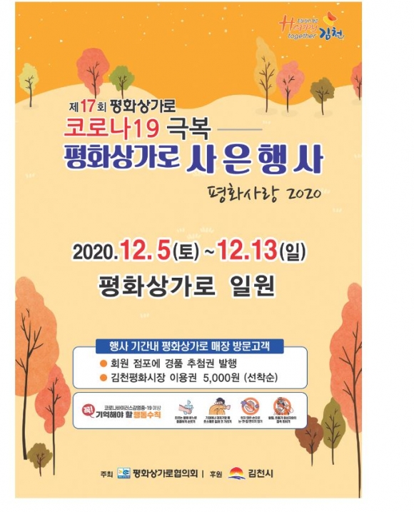평화로상가는 행사기간 중 고객들에게 상가로 자체 상품권(5만원 상당) 추첨에 참여할 수 있는 응모권을 제공하며, 평화시장에서 사용할 수 있는 상품권(5천원 상당)도 일부 지급한다. 또한 안전한 쇼핑환경을 제공하기 위하여 발열체크기를 각 매장별로 비치한다.평화시장 김한규 상인회장과 평화로상가 김세호 협의회장은 “철저한 자체방역과 올바른 마스크 착용 등으로 코로나19 재확산을 예방하고, 올 한해 어려운 상황 속에서도 방문해준 고객들에게 이번 행사를 통해 은혜를 갚고 상인들에게도 위로가 되길 바란다”고 말했다.한편, 김충섭 김천시장은 “코로나19 장기화로 상인들이 힘든 상황에서도 견뎌내고 있는 것에 감사와 격려를 전하며, 철저한 개인위생관리 생활화와 방역수칙 준수로 전국가적인 위기를 극복하고, 이번 행사를 계기로 시민들의 소비를 유도하여 시장 및 상점가 경기가 회복되길 기대한다”고 말했다.