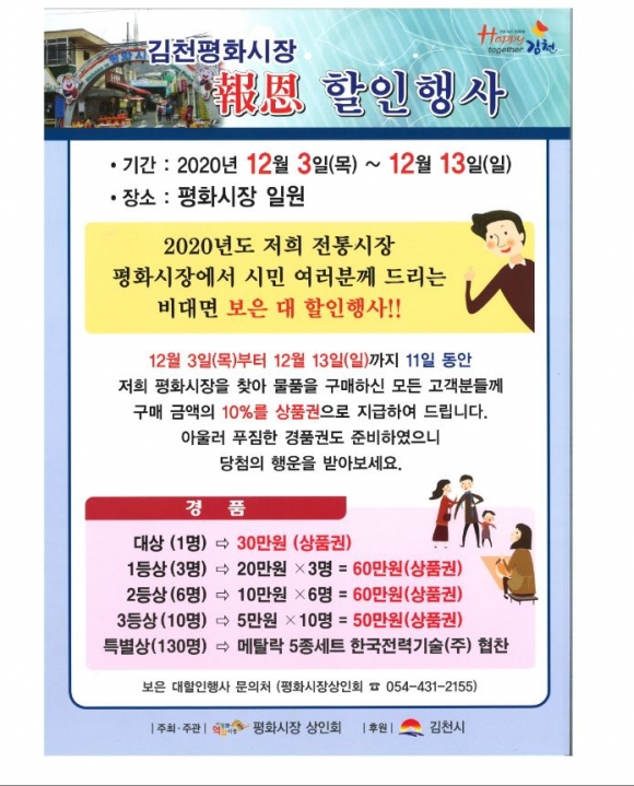김천 평화시장은 소비자의 날인 12월 3일(목)부터 12월 13일(일)까지 11일간 보은 할인행사를 진행하고, 평화로상가는 사은행사를 12월 5일(토)부터 12월 13일(일)까지 9일간 진행한다고 밝혔다.이번 행사는 코로나19가 재확산 됨에 따라 기존 문화공연 및 고객체험행사와 같은 대면행사를 지양하고, 평화시장과 평화로상가를 이용하는 고객들에게 감사의 마음을 전하기 위한 할인 및 사은행사로 진행된다.평화시장은 코로나19로 인한 경기침체 장기화로 지친 시민들과 상인들을 위하여 행사기간 중 구매한 금액의 10%를 시장 자체상품권으로 증정한다. 더불어 비대면 경품 추첨을 통한 행운의 기회도 제공한다.