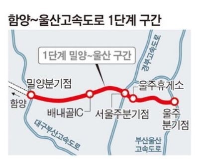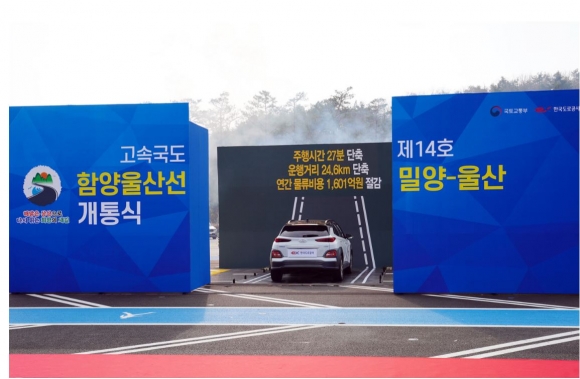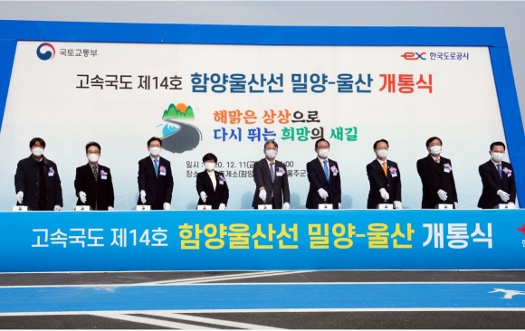 밀양 울산간 고속도로가 지난 11일 개통했다. 한국도로공사 밀양울산사업단이 추진한 밀양~울산 고속도로는 함양~울산간 고속도로의 동부구간으로 총 144.6km 구간 중 45.2km에 해당한다. 밀양~울산간 기존도로에 비해 24.6km를 단축해 주행시간 27분이면 울산에 진입 가능하며, 연장의 77%가 터널과 교량으로 시공돼 자연훼손을 최소화하고 영남알프스의 경관도 보전할 수 있게 했다.