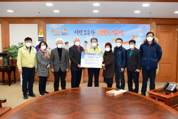 아포읍단체협의회(회장 박희병)는 22일 김천시청을 방문하여 연말연시 어려운 이웃들을 위해 500만원의 이웃돕기 성금을 전달했다.박희병 대표는 “아포읍단체협의회에서 한마음 한뜻으로 어려운 이웃에게 희망을 전달하고 싶어 희망2021나눔캠페인에 동참하게 되었다. 작은 마음이지만 어려운 이웃들과 함께 나눌 수 있어 기쁘다.”고 말했다.김충섭 김천시장은 “이웃에 대한 나눔의 마음을 모아 성금을 기탁해주신 아포읍단체협의회에 깊은 감사를 드린다. 의미 있는 나눔이 가치 있게 사용 될 수 있도록 잘 전달하겠다.”고 밝혔다.한편 이날 김천시 아포읍행정복지센터 직원들도 함께 동참하여 100만원의 성금을 전달했으며, 기탁된 성금은 경북사회복지공동모금회를 통해 추운 겨울을 힘들게 보내고 있을 관내 어려운 이웃들에게 지원될 예정이다.