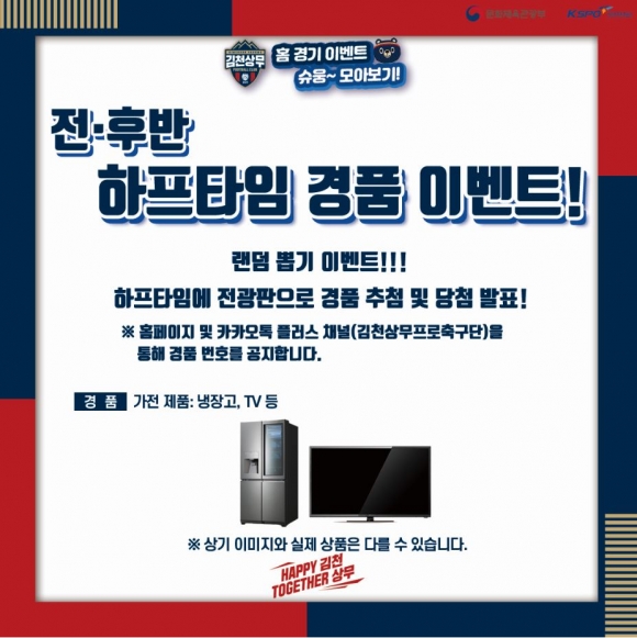 이렇듯 경기장 안팎을 새단장하며 김천은 팬 맞이 준비를 끝냈다. 쏟아지는 경품 & 이벤트로 팬 만족도 높인다!김천은 홈 개막전에서 하프타임 경품 이벤트를 진행한다. 냉장고, TV 등 전자제품을 무작위 추첨을 통해 제공한다. 추첨과 동시에 전광판에 경품 번호를 표출하며 이후 홈페이지, 김천상무 카카오톡 플러스 채널을 통해 경품 번호를 공지할 예정이다. 직관인증 이벤트도 진행한다. 경기장 입장 후 경기장 배경으로 인증사진 촬영 후 인스타그램에 #김천상무직관 해시태그를 포함해 게시하면 2명을 선정해 선수 친필싸인 유니폼을 제공한다. 김천상무 공식 인스타그램으로 당첨자를 공지할 예정이다. 또한 전 관중을 대상으로 응원용 클래퍼 3,000매를 입장 게이트인 외6문, 외7문, 가변석 출입게이트를 통해 배부하며 가변석 관중 대상으로 선착순 100명에게는 응원 타올을 증정한다. 지난 15일부터 26일까지 김천상무 공식 홈페이지로 응모 받았던 전광판 영상 이벤트도 진행할 예정이다. 코로나 극복 영상 및 사진, 김천상무 승리 응원 영상 및 사진은 경기 전 송출할 예정이다. 선정된 응모자들에게는 선수 친필 싸인 MD를 증정한다.경기 시작 2시간 반 전부터 경기 종료 시 까지는 매점 옆에서 포토존 이벤트를 진행하며 경기 시작 직전에는 승리의 클래퍼 타임을 실시해 장내 아나운서의 육성에 맞춰 클래퍼 퍼포먼스를 진행할 예정이다. ‘성공적 데뷔’ 김천 신병들, 이제는 리그다! 김천은 지난 28일 ‘2021 하나은행 FA컵’ 2R 평택시티즌과 홈경기서 신병 선수들의 맹활약으로 8대 0으로 대승을 거뒀다. 특히 정승현, 하창래는 센터백으로 선발 출전해 무실점을 기록했고 정현철은 미드필더로 선발 출전해 득점과 함께 승리를 이끌었다.교체 멤버 조규성, 김주성, 서진수 또한 그라운드를 밟았고 서진수는 교체 투입과 함께 프로 데뷔 골을 터뜨리며 진가를 발휘했다. 신병과 기존 선수들 간 호흡을 맞춘 지 보름도 채 안 된 시점에서 경기를 뛰었다는 점을 감안하면 시간이 지날수록 선수들 간 합이 더욱 맞아갈 예정이다. 권경원, 박병현 등 센터백과 미드필더 박용우의 시즌 시작 직전 부상으로 리그 출전이 어려운 상황이기에 신병 선수들의 합류는 더욱 반가울 수밖에 없다. 신병 선수들의 활약이 리그까지 이어져 홈 개막전에서 김천이 반드시 승리를 가져오겠다는 각오다. 한편, 오는 4일 안양과 홈 개막전은 TV 중계 스카이스포츠(U+tv 111번, 올레tv 54번, Btv 125번, sky life 202번)에서 시청할 수 있으며 온라인 중계는 네이버, 다음 카카오, 아프리카tv에서 진행된다. |
