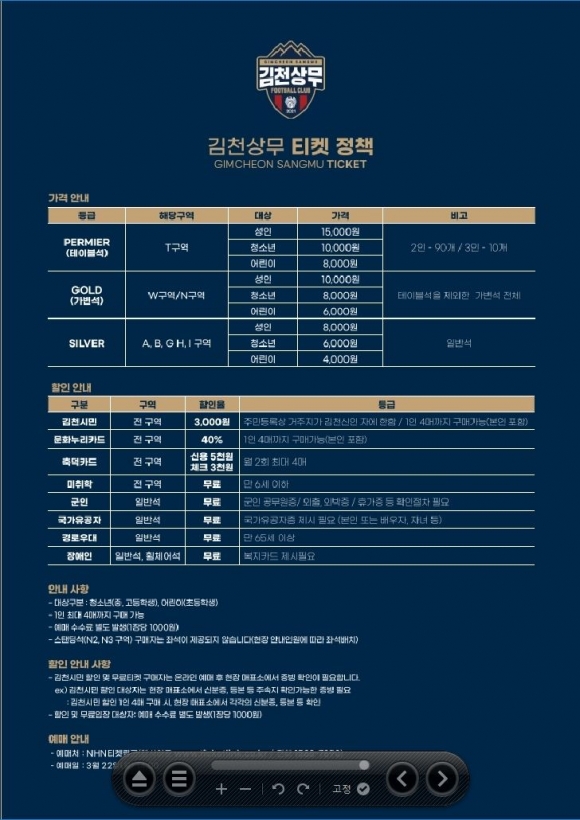 김천상무프로축구단(대표이사 배낙호)이 5일 오전 11시, 온라인 예매 사이트 티켓링크를 통해 10일 오후 6시 30분 김천종합운동장에서 열리는 ‘하나원큐 K리그2 2021’ 6R 부천FC와 홈경기 온라인 예매를 시작했다. 방역당국의 사회적 거리두기 단계 지침에 따라 김천은 총 3,066석을 개방했다.전 좌석은 1인 4매까지 온라인 예매만 가능하며 경기 당일 현장 구매는 불가능하다. 예매 가능 좌석은 테이블석(T구역)을 포함한 가변석A(W구역), 스탠딩석을 포함한 가변석B(N구역), A,B,G,H,I구역이다. 생생한 현장감을 느낄 수 있는 가변석은 총 724석 예매 가능하다.