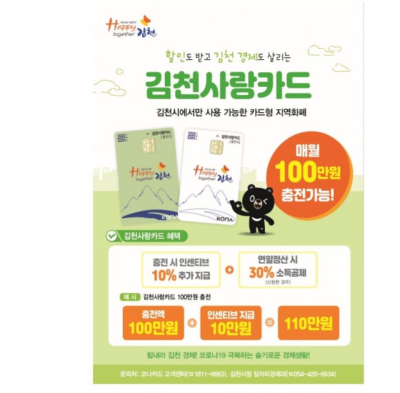 김천시(시장 김충섭)에서는 김천사랑카드의 개인별 할인구매한도를 4월 8일부터 월 100만원으로 상향한다고 밝혔다.김천시는 금년에 김천사랑카드와 상품권을 500억원 발행하기로 하였으나, 코로나19로 인한 경영난을 겪고 있는 소상공인과 자영업자들에게 김천사랑카드와 상품권이 실질적으로 도움이 된다는 판단에 따라 1,000억원까지 확대해서 발행하기로 했다.아울러 개인별 할인구매한도를 월 70만원에서 100만원까지 확대하고, 가맹점의 환전한도도 직전 분기 매출액의 60%까지 가능하도록 조례를 개정했다.시에서는 지난해 김천사랑카드 사용현황을 분석한 결과 음식점(33.7%), 슈퍼마켓·편의점(19.1%), 주유소(10.2%), 농·축협직판장(9.1%), 병원·약국(8.9%), 학원(4.3%), 기타(14.7%) 등으로 나타났다. 또한 대규모 점포나 준대규모 점포, 유흥업소 등 상품권 사용이 적합하지 않다고 인정되는 업소, 프랜차이즈 업소 중 본사가 타지역에 있는 경우 등에서는 카드를 사용하지 못하도록 하였다.따라서 김천사랑카드와 상품권이 팔리는 만큼 지역의 소상공인과 자영업자들에게 실질적인 혜택이 돌아가기 때문에 시에서는 다양한 방법을 동원한 판매 전략을 수립하기 위해 이번에 한도 조정을 한 것이다.
