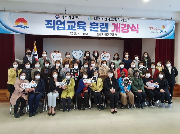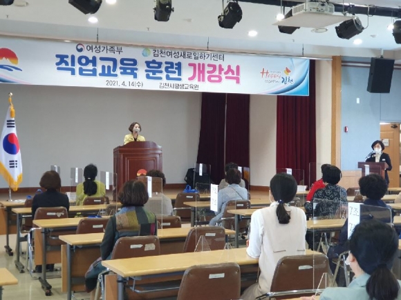 김천시 평생교육원에서 운영하는 여성새로일하기센터에서 2021. 4. 14.(수) 교육생 40명이 참석한 가운데 직업교육 훈련 개강식을 개최했다.이번에 개강한「산모, 신생아 돌봄 케어 마스터 과정」과「실버 행복 전문가 양성」은 요즘 가장 인기있는 직업훈련 과목으로 4. 14 ∼ 7. 5까지 약 3개월 과정으로 운영되며, 교육수료 후에는 산후관리사, 실버 인지 놀이 지도사 2급 자격증을 취득하게 된다.