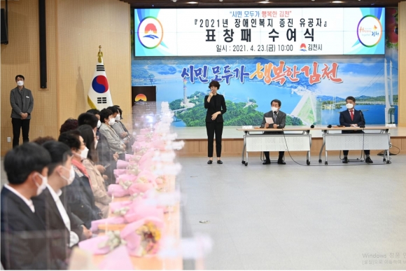 김천시(시장 김충섭)는「제41회 장애인의 날」을 기념하여 23일(금) 김천시청 강당에서 장애인 복지에 이바지한 유공자에게 표창식을 수여하였다.이날 행사에는 김충섭 김천시장을 비롯해, 나영민 시의회 부의장, 김천시 11개 장애인단체 대표자들과 관계자, 장애인 복지증진 유공자 분들이 참석해 ‘장애인의 날’의 의미를 되새기는 뜻깊은 시간을 가졌다.작년부터 이어진 코로나19로 인해 축소되어 진행된 이번 ‘장애인의 날’ 행사는 시장표창 21명, 의장표창 11명, 국회의장상 9명으로 총 41명의 장애인 복지증진 유공자분들을 표창하는 것으로 대신하였으며, 1만 천명 김천시 장애인분들과 함께 하지 못하는 아쉬움은 참석하신 분들의 박수와 격려로 대신하였다.