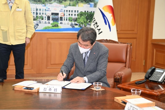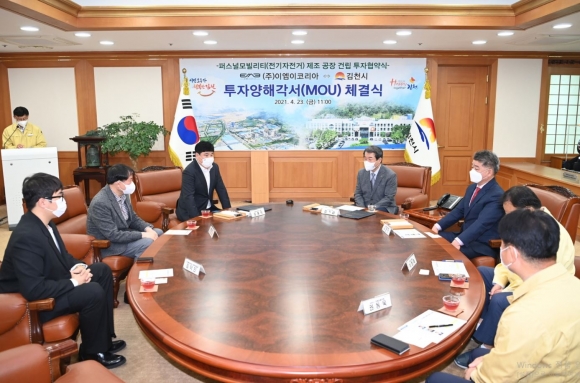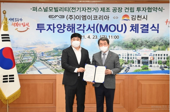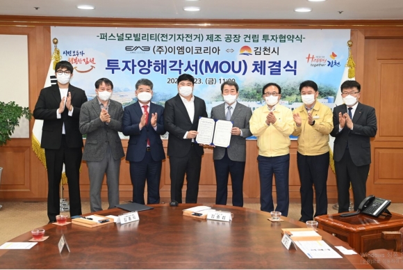김천시(김천시장 김충섭)는 23일 오전 11시 김천시청 접견실에서 김충섭 김천시장, 나영민 시의회 부의장, ㈜이엠이코리아 김홍식 대표 등이 참석한 가운데 퍼스널 모빌리티 생산을 위한 투자양해각서(MOU)를 체결했다.이번 투자협약은 김천일반산업단지(3단계)내 17,543㎡(5,300평)부지에 총73억을 투자하여 전기자전거, 전동스쿠터, 전동킥보드 생산 공장을 건립, 최소 30명 이상의 신규 일자리를 창출할 예정이다.