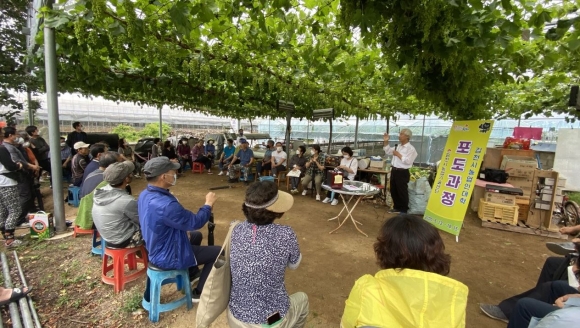 올해 농업인 실용교육을 통해 농한기 포도교육, 김천시 포도대학 기초·심화 과정, 샤인머스켓 특별과정 등으로 수준별·시기별 교육 수요를 충족하고 있으며, 아울러 코로나-19가 확산되면서 시기별 농업인교육을 적기에 추진 하기 위해 김천시는 도내 최초로 농업인을 위한 온라인 스마트 퀵 교육 서비스를 개시하여 전년대비 교재제작예산은 48,200천원이 절감되는 반면, 지난해 온라인+오프라인 교육 참여자는 총 29,600명으로 많은 농업인이 교육에 관심을 보였다.