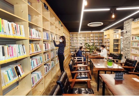 그 식당들 가운데에 위치한 사명 북카페는 기존 무안면복지센터의 방치된 1층 공간을 아기자기하고 산뜻하게 보수해 마련한 주민들의 사랑방 같은 공간이다. 무안면 주민자치위원회의 자체기금으로 자발적으로 조성됐으며, 코로나19로 인해 개소식은 생략한 채 지난해 9월부터 운영되고 있다. ▶ 키즈존, 에세이룸, 다용도 회의공간 등 알찬 공간 활용 돋보여카페에는 기존에 무안면에서 운영하고 있던 작은 도서관의 책들과 출향인사, 지역단체들로부터 기부 받은 약 3,800여권의 다양한 도서들이 구비돼 있어 편리하게 대여가 가능하다.