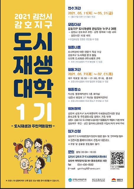 김천시(시장 김충섭)는 오는 5월 11일부터 21일까지 ‘2021년 김천시 감호지구 도시재생대학 1기’수강생을 모집한다고 밝혔다.이번 도시재생대학은 도시재생뉴딜사업의 일환으로 주민들의 참여와 역량강화를 위한 주민 스스로 참여하는 교육으로 5월 27일부터 7월 1일까지 매주 목요일 총 6주간 진행 될 예정이며, 코로나19 방역지침에 따라 참여인원은 최소화하여 도시재생에서 주민의 역할, 도시재생의 국내외 우수사례 등과 같은 전문가의 특강과 우수 선진지 답사, 감호지구 도시재생에 대한 주제로 이뤄진다.도시재생에 관심 있는 김천시민 누구나 신청 가능하며, 참여를 희망하는 시민은 감호지구 도시재생현장지원센터 방문 또는 전자메일(gamhog9@naver.com)을 통해 접수할 수 있다.또한, 자세한 사항은 김천시 홈페이지 확인 및 김천시 감호지구 도시재생현장지원센터(☎054-436-9582)를 통해 안내 받을 수 있다.김천시 관계자는 “이번 도시재생대학의 다양한 프로그램을 통해 주민역량을 강화하고, 하반기에도 도시재생대학이 운영 될 예정이니만큼 김천시민의 많은 관심과 적극적인 참여를 바란다”고 말했다.한편 감호지구 도시재생 뉴딜사업은 지난 2020년 4월 승인․고시되었으며 국비 141억원을 포함 총 263억원 투입하여 2024년 사업준공을 목표로 해피러닝어울림플랫폼, 은빛복지센터, 안심도로 및 공영주차장 조성 등을 통해 주민들의 삶의 질 향상과 도심기능 회복 및 지역경제 활성화를 추진하는 사업이다.