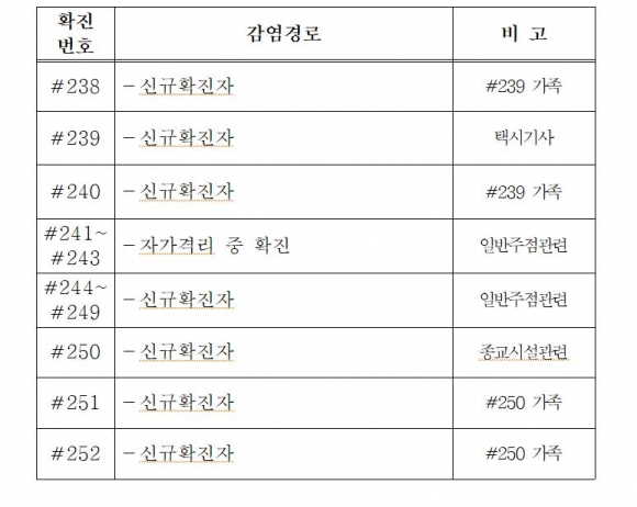 - #250~252번 3명 확진자는 일가족확진자이며, 역학조사 중임.