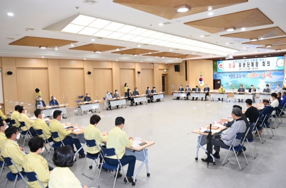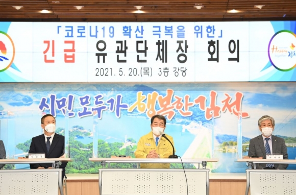 김천시(시장 김충섭)는 5월 20일 종교계, 경제계, 시민단체 등 유관단체장들이 참석한 가운데 사회적 거리두기 2단계 시행과 코로나19 극복을 위한 긴급대책 회의를 개최하였다.
