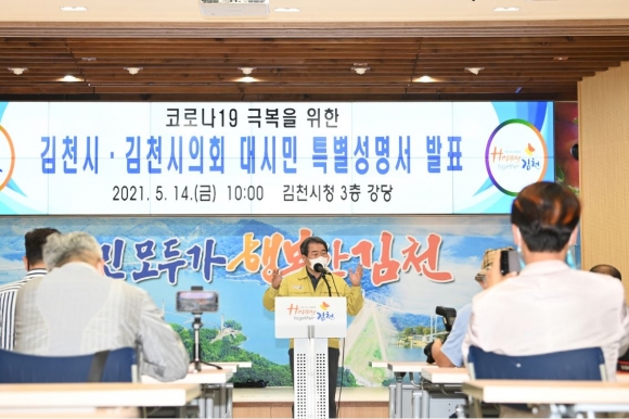 2021년 5월 24일 현재 김천시는 94,839명의 검체를 채취하여 검사했으며, 이중 감염자가 275명, 치료자 115명, 완치자 156명, 사망 4명, 격리자 423(누계 4,971)명이다.사회적 거리두기 1.5단계 --> 2단계 검역지침 강화지난 4월18일부터 5월 14일까지, 4주간 코로나19 확진자가 집단적으로 발생함에 따라 추가확산 방지를 위해 사회적 거리두기를 1.5단계에서 2단계로 상향조정 하는 성명서를 5월 14일 발표했다.
