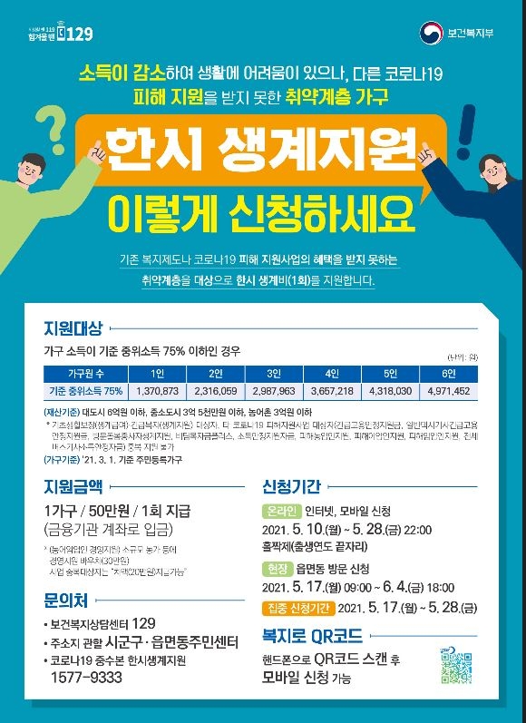김천시(시장 김충섭)는 코로나 4차 맞춤형 피해대책인 한시 생계지원 접수를 오는 6월 4일 마감함에 따라 아직 신청하지 않은 저소득 위기가구는 서둘러 신청할 것을 당부하였다.신청은 6월 4일 오후 6시까지 읍면동 행정복지센터에서 할 수 있고, 가구원이나 대리인도 신청이 가능하다.  지원 대상은 2021년 3월 1일 기준 김천시에 주소지를 둔 가구 중 올해 1~5월 소득이 2019년 또는 2020년 소득보다 감소하고, 기준중위소득 75% 이하(1인 1,370,873원, 2인 2,316,059원 3인 2,987,963원, 4인 3,657,218원), 재산 3억 5천만원 이하인 세대로 6월 말 신청계좌로 50만원 지급할 예정이다.다만, 이번 코로나19 재난 한시생계지원은 중복 지급이 되지 않기에, 기초생활보장 생계급여 가구, 긴급복지 생계지원 가구 또는 긴급고용안정지원금‧버팀목플러스자금 등 4차 재난지원금을 받은 가구는 제외된다. 소규모 농가 경영지원 바우처 30만원을 수령한 가구는 한시생계지원금을 신청할 수 있지만, 지급대상으로 선정될 경우 바우처 지원금을 제외한 20만원이 지급된다. 시 관계자는“코로나19로 소득이 감소해 어려움을 겪고 있는 가구는 서둘러 신청해주길 바란다.”고 말했다.