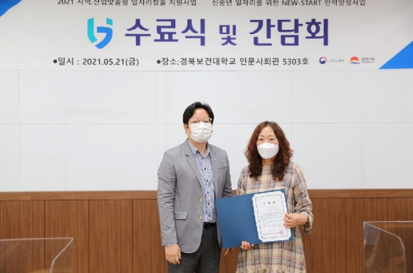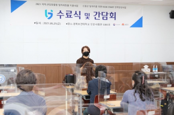 경북보건대학교(총장 이은직) 산학협력단은 고용노동부와 김천시가 주관하고 한국전력기술(주)과 한국교통안전공단이 후원하는 「2021년 지역‧산업맞춤형 일자리창출 지원사업-신중년 일자리를 위한 NEW-START 인력양성사업」의 수료식을 지난 5월 21일(금) 경북보건대학교에서 개최하였다.이날 수료식에는 교육수료생 22명, 한국치매예방협회 김천지부 박소현 지부장, 경북창조경제혁신센터 임언수 팀장, 경북보건대학교 관계자 등 약 30명이 참석했다.