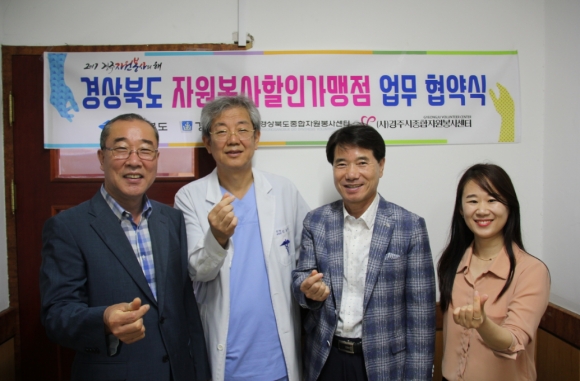 [밝은미래신문=뉴스팀](사)경주시종합자원봉사센터(이사장 조문호)는 10일 자원봉사자를 위해 관내 전문 의료병원인 현대병원과 자원봉사할인가맹점 업무협약을(MOU) 체결했다. 이날 협약식에서는 ‘자원봉사자의 건강 증진 및 자원봉사 활성화를 위한 업무협약’과 ‘자원봉사 할인가맹점 현판전달식’이 진행됐다. ‘경상북도자원봉사할인가맹점’이란 경주시 지역 자원봉사자의 활동을 격려하기 위해 ‘자원봉사자증’을 소지한 자원봉사자들을 대상으로 약정된 할인혜택을 제공해주는 나눔 경영실천 업체를 뜻한다. 김종원.조윤철 현대병원장은 “자원봉사자들이 봉사활동 하는데 건강한 신체를 가꾸며 봉사자의 고충을 조금이라도 덜어 드리고자 MOU를 체결하게 됐다”라고 소감을 밝혔다. 조문호 (사)경주시종합자원봉사센터 이사장은 “어려운 이웃과 지역사회 발전을 위해 대가없이 자원봉사활동을 하고 있는 자원봉사자들에게 지역사회로부터 그 가치를 인정받고, 혜택을 드리기 위한 자원봉사자 인정보상제도가 더 확대될 수 있도록 노력하겠다”라고 말했다. 한편, (사)경주시종합자원봉사센터에서는 2년 동안 50시간 이상 봉사활동실적이 있는 우수자원봉사자를 대상으로 자원봉사자증을 발급하고 있으며, 이 자원봉사자증을 소지한 자원봉사자들에게 할인혜택을 제공하는 ‘경상북도자원봉사할인가맹점’을 상시 모집하고 있다.(문의 : 경주시종합자원봉사센터 054-771-1365)