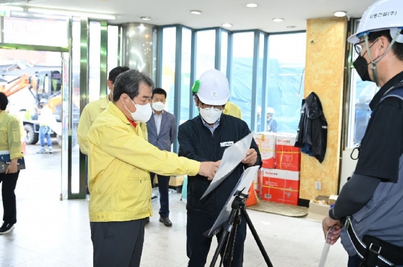 김충섭 시장은 사업현장을 둘러보며 건설현장 관계자 및 복합문화센터 입주기관 직원들을 격려하고 안전사고가 없도록 당부하는 한편, “복합문화센터 및 행복주택 조성 등 도시재생사업을 통해 평화동 원도심에 많은 사람들이 모여 지역상권이 되살아나고 활력 넘치는 옛 모습을 기대한다.”고 말했다.