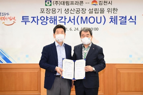 김천시(김천시장 김충섭)는 24일 오전 10시 김천시청 접견실에서 김충섭 김천시장, 이우청 시의회 의장, ㈜대림프라콘 김동수 대표 등이 참석한 가운데 포장용기 생산공장 설립을 위한 투자양해각서(MOU)를 체결했다.이번 투자협약은 김천일반산업단지(2단계)내 28,423㎡(8,600평)부지에 총 200억을 투자하여 신기술 포장용기 생산공장을 건립 최소 80명 이상의 신규 일자리를 창출할 예정이다.