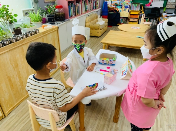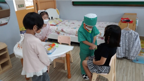 우리가 아프면 병원으로 옮겨지게 되어 몸이 아픈 곳에 따라 가야하는 병원이 다르다는 것과 건강과 위생에 늘 관심을 가져야 건강하게 생활 할 수 있다는 것을 알고 여러 종류의 병원에 대해 구체적으로 알아보는 활동을 하였다.유치원 친구들이 함께 병원 놀이에 필요한 반사경 간호사 모자 간판을 직접 만들고 의사, 간호사, 약사, 환자, 역할을 나누어서 가운을 입고 병원 놀이에 즐겁게 참여해 봄으로써 병원에서 하는 일과 의사, 간호사, 약사, 환자의 차이에 대해 알수 있는 좋은 기회가 되었다.