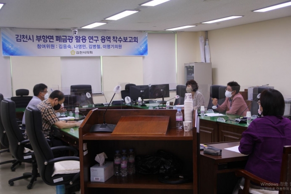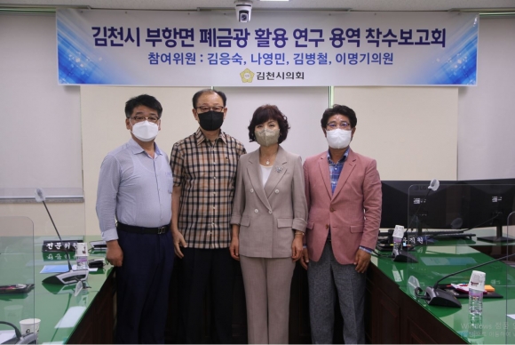 김천시의회(의장 이우청)‘김천시 부항면 폐금광 활용 연구모임’은 7월 19일 김천시의회 2층 회의실에서 “김천시 부항면 폐금광 활성화 방안에 관한 연구용역”착수보고회를 개최했다.연구모임은 김응숙 의원을 대표로 나영민․김병철․이명기 의원이 함께 참여하고 있다. 이 모임은 김천과 금의 관련 사료들의 기록을 연구하여 부항면 폐금광 일대를 관광상품화하여 김천의 독특하고 자생적인 문화와 역사를 체험하고 즐길 수 있는 컨텐츠 개발을 연구하는 것을 목적으로 하고 있다.