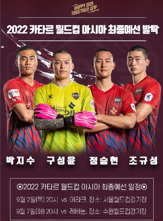 23일 대한축구협회(KFA)는 2022 카타르 월드컵 아시아 최종예선 1,2차전에 참가하는 국가대표팀 명단을 발표했다. 국가대표팀 명단에는 김천상무(대표이사 배낙호) 구성윤(GK), 박지수, 정승현(이상 DF), 조규성(FW)이 이름을 올렸다. 김천은 K리그 구단 중 최다인 4명을 배출해 K리그1 울산현대(3명), 전북현대(2명) 보다도 앞선다. 김천은 꾸준히 명단에 들었던 구성윤, 박지수와 함께 정승현이 9개월 만에 재발탁됐다. 올림픽 대표팀에 꾸준히 이름을 올렸던 조규성은 국가대표팀 최초발탁이다.벤투 감독은 국가대표팀에 최초발탁된 조규성에 대해 “기술이 뛰어나고 제공권도 좋은 선수다. 라인 사이에서도 좋은 플레이를 하고 기타 다양한 장점이 있다”고 언급했다. 조규성은 이에 대해 “믿어주시고 좋게 평가해주셔서 정말 감사하다. 대표팀 최초 발탁이기에 설레는 마음이다. 늘 하던대로 마지막이라는 마음을 갖고 임하겠다. 또한 공격수로서 득점할 수 있도록 집중하고 경쟁력 있는 모습을 보여드리겠다”고 전했다. 구성윤은 “다시 한번 국가의 대표 선수로 뽑혀 대단히 영광스럽다. 국군체육 대표 선수로서 가서 군인의 명예를 살리고 수사불패 정신으로 최선을 다하고 오겠다”는 소감을 전했다.올림픽 와일드 카드 출전 이후 곧바로 국가대표팀에 발탁된 박지수는 “다시 한 번 대표팀 옷을 입게 돼 영광이다. 군인정신으로 팀에 헌신하고 좋은 결과를 가져올 수 있도록 수사불패의 정신으로 경기에 임하겠다”고 소감을 말했다. 정승현은 “오랜만에 대표팀에 선발돼 영광스럽다. 팀에 희생하는 군인정신을 보이고 돌아오겠다”고 소감을 말했다.  한편, 명단에 포함된 선수단은 30일 파주 국가대표트레이닝센터(NFC)에 소집돼 9월 2일 서울 월드컵경기장에서 이라크, 7일 수원 월드컵경기장에서 레바논과 경기를 치른다.