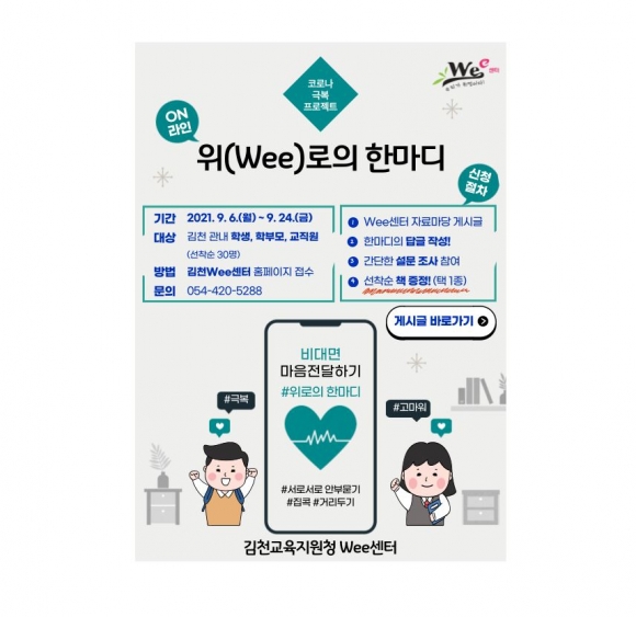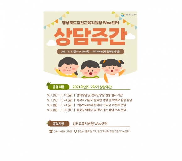 경상북도김천교육지원청(교육장 박삼봉) Wee센터는 9월 1일(수)부터 9월 30일(목)까지 학생들의 다양한 위기상황을 예방하고 학교생활 적응력을 향상시키기 위해 2021학년도 2학기 상담주간을 운영한다. 새 학기를 맞은 학생들의 즐겁고 안정적인 학교생활을 응원하기 위해 이번 상담주간 동안 김천Wee센터에서는 다양한 오프라인, 온라인 프로그램들을 운영할 예정이다.코로나19 확산 방지를 위해 전화상담 및 온라인 상담을 집중적으로 실시하고, 김천교육지원청 홈페이지를 활용하여 ‘위(Wee)로의 한마디’ 이벤트를 진행한다.