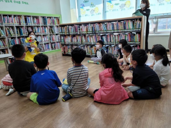 김천서부초등학교병설유치원(원장 구본일) 유아 6명은 지난 10월 1일에 가까이에 있는 김천시립 도서관에서 유아들을 대상으로 “오감 책놀이 도서관에서 놀자” 사서가 들려주는 도서관 이야기 체험활동에 참여하게 되었다. 유치원에서 동화책을 읽고 퀴즈 놀이, 만들기 활동, 게임 등의 활동을 교사와 함께 자주 해보았지만, 도서관에서 하는 놀이활동은 처음으로 함께 해 보았다.