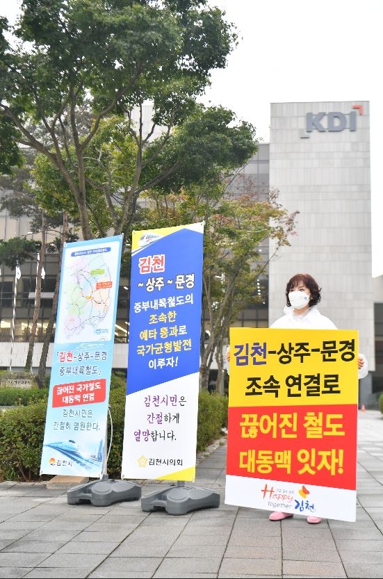 김천시의회(이우청 의장) 의원들이 6~7일 양일간 세종시 한국개발연구원(KDI) 앞에서 중부내륙철도 미개통구간인 김천~문경 구간의 조속한 시행을 촉구하며 1인 시위에 나섰다.