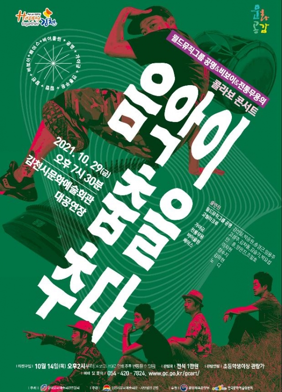 김천시 문화예술회관(관장 신동균)에서는 기획공연 ‘월드뮤직그룹 공명&비보이&전통무용 콜라보 콘서트 <음악이 춤을 추다>’를 오는 10월 29일(금) 오후 7시 30분에 문화예술회관 대공연장에서 개최한다.‘월드뮤직그룹 공명&비보이&전통무용 콜라보 콘서트 <음악이 춤을 추다>’는 2021년 문화체육관광부 국고지원사업인 방방곡곡 문화공감 사업의 일환으로 한국문화예술회관연합회가 주최하고, 문화체육관광부와 한국문화예술위원회에서 후원하는 작품으로 월드뮤직그룹 공명(4인), 고릴라크루(7인), 이지현(가야금), 노디(베이스), 장수지(전통무용), 김미현(바이올린)이 출연하여 다양한 장르의 공연들을 콜라보 형식으로 보여준다.이번 공연은 새로운 우리 음악이라는 타이틀로 초등학교 교과서에 소개가 되기도 한 ‘통해야’등을 연주하며 다양한 프로그램 구성으로 전 세대 관객들이 즐길 수 있는 풍성한 음악과 볼거리를 제공한다.문화예술회관에서는 공연 감상을 위해 방문한 관람객들이 안심하고 관람할 수 있도록 공연장 소독, 손소독제 비치 등 방역 활동에 총력을 기울이고 있다.공연 시간은 약 90분 정도이며, 초등학생이상 관람이 가능하다. 공연 관람료는 전석 1만 원이며 유료회원은 30% 할인된 가격에 구매할 수 있다. 관람권은 10월 14일(목) 오후 2시부터 문화예술회관 홈페이지(www.gc.go.kr/gcart/) 등을 통해 예매할 수 있다.문의) ☎ 054-420-7824, 홈페이지 https://www.gc.go.kr/gcart/