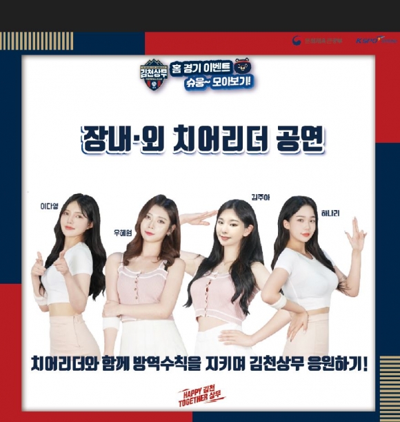 김천상무프로축구단(대표이사 배낙호)이 23일 오후 6시 30분 김천종합운동장에서 ‘하나원큐 K리그2 2021’ 35R 전남드래곤즈와 홈경기를 치른다. 직전 라운드에서 ‘하나원큐 2021 K리그2’ 우승을 확정 지은 김천은 우승 세리머니를 포함해 다양한 이벤트로 팬들을 맞이한다.입장 시, 전 관중에게 우승 기념 마스크, 우승 기념 클래퍼를 증정한다.