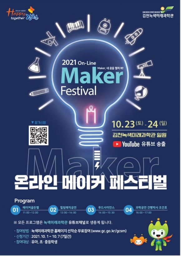 김천시(시장 김충섭) 김천녹색미래과학관에서는 「2021 온라인 메이커 페스티벌」행사를 10월 23부터 10월 24일까지 2일간 개최한다고 밝혔다.이번 「2021 온라인 메이커 페스티벌」은 코로나-19로 집콕 생활이 늘어난 어린이, 청소년들을 대상으로 집에서도 다양한 과학놀이를 체험하고 소통할 수 있는 온라인 줌 방식으로 진행하게 된다.