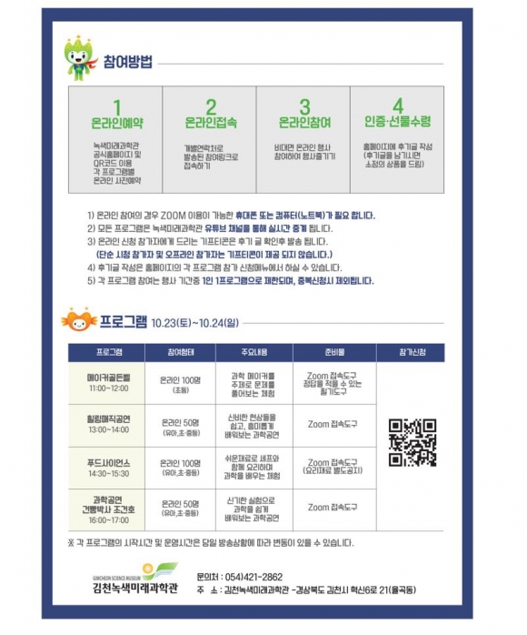 체험 프로그램으로는 과학 메이커를 주제로 문제를 풀어보고 상품도 받는“메이커 골든벨”과 과학실험 공연으로 신기한 현상들을 배워보고 소통할 수 있는 “힐링매직공연, 건빵박사 조건호”그리고 집에서 쉽게 구할 수 있는 재료들로 요리도 하고 과학을 배우는 “푸드사이언스”등 다양한 과학체험 프로그램들이 마련되어 있다.신청방법은 김천녹색미래과학관 홈페이지를 통하여 프로그램별 선착순으로 신청할 수 있으며, 참여자에게는 푸짐한 상품들도 준비되어 있다.김성환 정보기획과장은 “장기간 이어지는 코로나19로 인해 올해도 취소될 수 있는 행사를 온라인 방식을 적용하여 집에서도 쉽게 과학을 체험하고 즐길 수 있는 방안을 마련했으며, 앞으로 다양한 방법을 찾아 어린이, 청소년들이 과학관을 이용한 더욱 다채로운 과학 체험의 기회를 만들겠다.”고 말했다. |