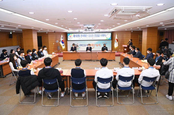 김천시체육회(회장 서정희)는 지난 27일 시청 2층 회의실에서‘제102회 전국체육대회’입상 선수에 대한 포상금 수여식을 개최했다. 이날 수여식에는 김충섭 시장, 서정희 체육회장, 이우청 시의회의장, 박삼봉 교육장, 김동열 체육회 상임부회장을 비롯해 바쁜 일정에도 입상자와 각 학교 지도자가 참석했으며, 전국체전 입상에 대한 격려와 함께 내년 전국체전에서의 선전을 다짐하는 자리를 가졌다.