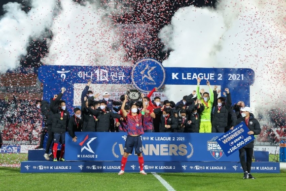 1, K리그2 최종 순위2021년 36경기를 치른 김천은 정규리그 2경기를 남기고 일찌감치 K리그2 우승을 차지하며 2022 시즌 K리그1으로의 승격을 확정지었다. 7,8월 치열한 1위 다툼 끝에 8월 23일 부산 원정에서 승리하며 1위를 굳힌 김천은 이후 2달 여 반 간 한 번도 다른 팀에 선두를 내주지 않았다.