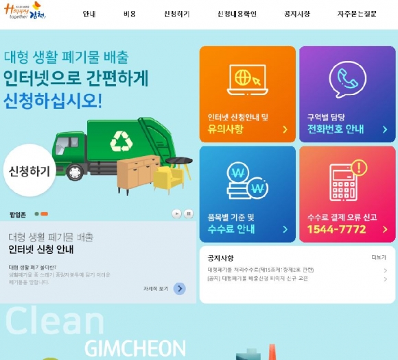 김천시(김천시장 김충섭)는 11월 22일부터 인터넷, 스마트폰으로도 언제 어디서나 대형폐기물 배출 신청이 가능한 온라인 서비스를 제공한다.기존 대형폐기물 배출신청은 읍면동 행정복지센터를 직접 방문하여 접수 후 발급받은 대형폐기물 스티커를 배출할 폐기물에 붙여 배출하는 방식이었으나, 이번에 도입되는 온라인 신청 시스템 이용 시 인터넷이 되는 곳이면 컴퓨터 또는 스마트폰을 이용해 배출신청을 할 수 있다.프린터가 없는 세대 또는 모바일을 통한 접수 시 신고필증 인쇄가 불가하기 때문에, 배출자가 신청완료 후 생성되는 신고번호를 별도 용지에 기재해 지정장소에 배출하면 수거자가 전산으로 확인 후 수거한다.대형폐기물 온라인 신청 시스템은 www.gc.go.kr/bigclean/ 또는 김천시청 홈페이지를 통해 접속할 수 있다. 임창현 자원순환과장은 “항상 청결한 도시환경을 만드는데 최선을 다하고 있으며, 대형폐기물 배출신고를 하지 않고 대형폐기물을 배출할 시 무단투기로 간주되니 꼭 배출신고를 한 후 배출 할 것을 부탁드린다.”고 밝혔다. |