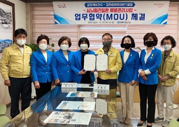 김천시보건소는 11월 17일(수) 11:30 송화라이온스클럽과 심뇌혈관질환예방관리를 위한 업무협약을 체결했다고 밝혔다.이날 협약식은 김천송화라이온스회장단 5명, 보건소 관계자가 참석한 가운데 우리나라 사망 주요 원인 중 암 관련 다음인 심뇌혈관질환이 갈수록 증가하고 있어 조기발견과 올바른 생활습관 실천 홍보·교육 등 공동협력 사업을 추진하고, 주민 건강증진사업에 상호 협력하는 등 심뇌혈관질환 극복을 위해 체결했다.송화라이온스클럽은 지역사회 봉사에 뜻을 가진 각계각층이 모인 봉사단체로서 무료 백내장 수술 등 안과질환 관련 등의 봉사활동을 오랫동안 해온 단체이다. 봉사활동을 통해 당뇨로 인한 실명이 증가하는 것을 보고 예방의 중요성에 대해 인식하면서 지역 주민에게 보탬이 되고자 협약을 맺기로 했다.장재근 김천시 보건소장은 지금까지 다양한 봉사활동을 꾸준히 해오신 것에 감사의 마음을 전하며 이번 협약을 통하여 앞으로도 시민들의 건강증진을 위한 디딤돌 역할을 해 줄 것을 당부했다. |