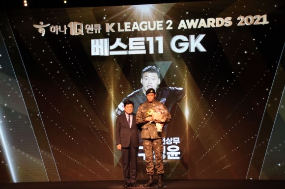 이어진 순서인 BEST 11 시상에서는 김천상무 구성윤(GK)과 정승현(DF)이 수상했다. 입대 동기인 구성윤과 정승현은 올 시즌 각각 18경기, 29경기를 소화했고 김천상무의 조기 우승을 확정하는 데 혁혁한 공을 세웠다. 구성윤은 18경기 11실점으로 경기당 0.61 실점을 기록했다. 출장 수의 절반이 넘는 10경기 클린시트와 함께 1도움까지 올렸다.