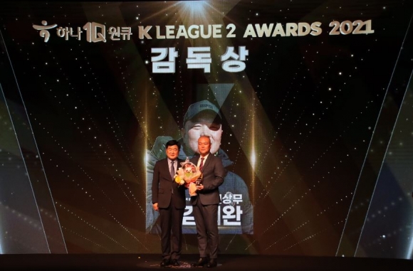 김천상무프로축구단(대표이사 배낙호)이 18일 오후 2시 상암동 누리꿈스퀘어 비즈니스타워 3층 국제회의실에서 열린 ‘하나원큐 K리그2 2021 대상 시상식’에서 김태완 감독, 구성윤, 정승현이 각각 감독상, BEST11(GK), BEST11(DF)을 수상했다.