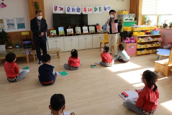 놀이로 세상을 배우는 행복학교, 봉계초등학교병설유치원(원장 문대동)은 11월 18일(목) 유아들을 대상으로 「꿈을 키우고 생각을 나누는 독서 퀴즈」 놀이를 개최하였다. 유아들은 평소 유치원에서 실시한 매일 한 권 그림책 보기 활동과 이야기 할머니 프로그램 및 가족과 책 읽기 등 가정연계 활동을 통해 그림책과 친숙해 질 수 있었다.