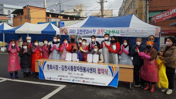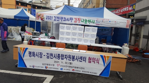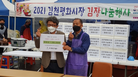 김천 평화시장 상인회에서는 독도사랑 국민연합회, 참빛 봉사회, 한국 국제문화교류협회 김천시지부, 김천을 사랑하는 사람들의 모임 봉사단과 함께 11월21일부터 22일 이틀에 걸쳐 따뜻한 겨울나기 사랑의 김장 나눔 행사를 가졌다.